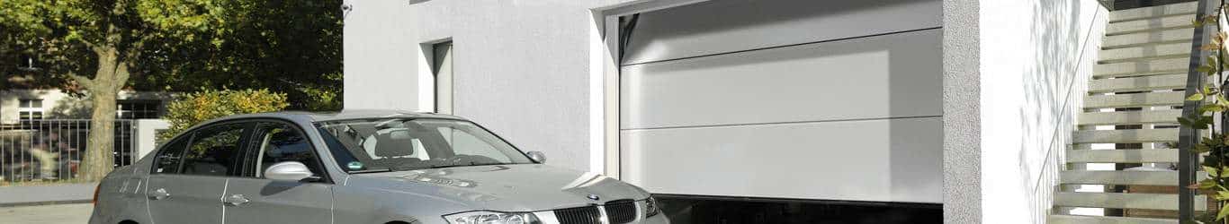 As their name implies, sectional garage doors are constructed from four or more rigid panels. The door panels are attached to roller wheels which fit into tracks which lift vertically and retract into the garage typically running under the internal roof line. With gasket seals around the whole frame, between each panel and a larger seal where the door meets the floor, they are quiet and form an excellent seal. The vertical opening mechanism means that the door opening can be higher, arched or even with angled corners.